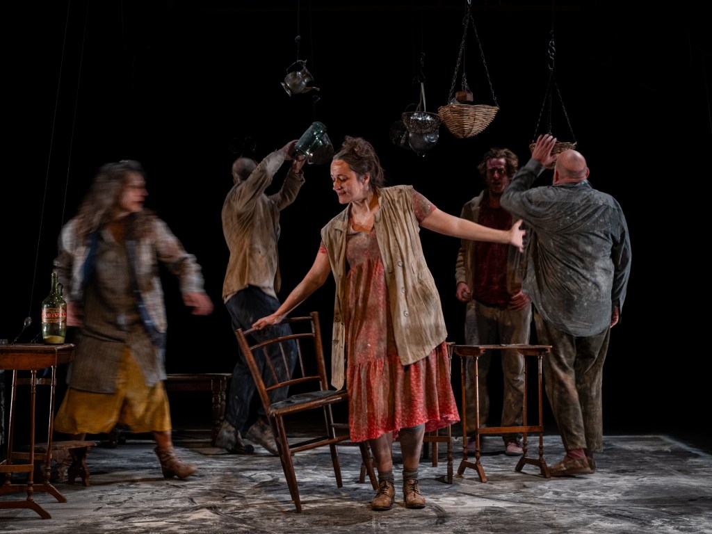 Les personnages glissent petit à petit dans la folie et la maladie, malgré leur résistance, leur vitalité, leur endurance. Ils se débattent, tout couverts de cette farine viciée qui s’éparpille partout. Doucement, sous nos yeux, ils sombrent presque sans que l’on s’en rende compte. Certes, il y a cette mère vaillante, incarnée par Charlotte Andrès, et ce père, pataud et touchant, joué par Arnaud Churin. Tous deux luttent admirablement par la bonhomie qu’ils inspirent contre cette tristesse qu’est la misère. Ils offrent des moments de grâce bienvenue et adoucissent, le plus longtemps possible, l’âpreté de leur réalité. Néanmoins, c’est forcé, à mesure que le temps passe, l’on rigole de moins en moins, l’horizon s’obscurcit, et presque sans que l’on s’en aperçoive, à l’endroit même où nous sommes entrés pour retrouver un peu de chaleur, l’on finit par se lever, partir et peut-être même pleurer.